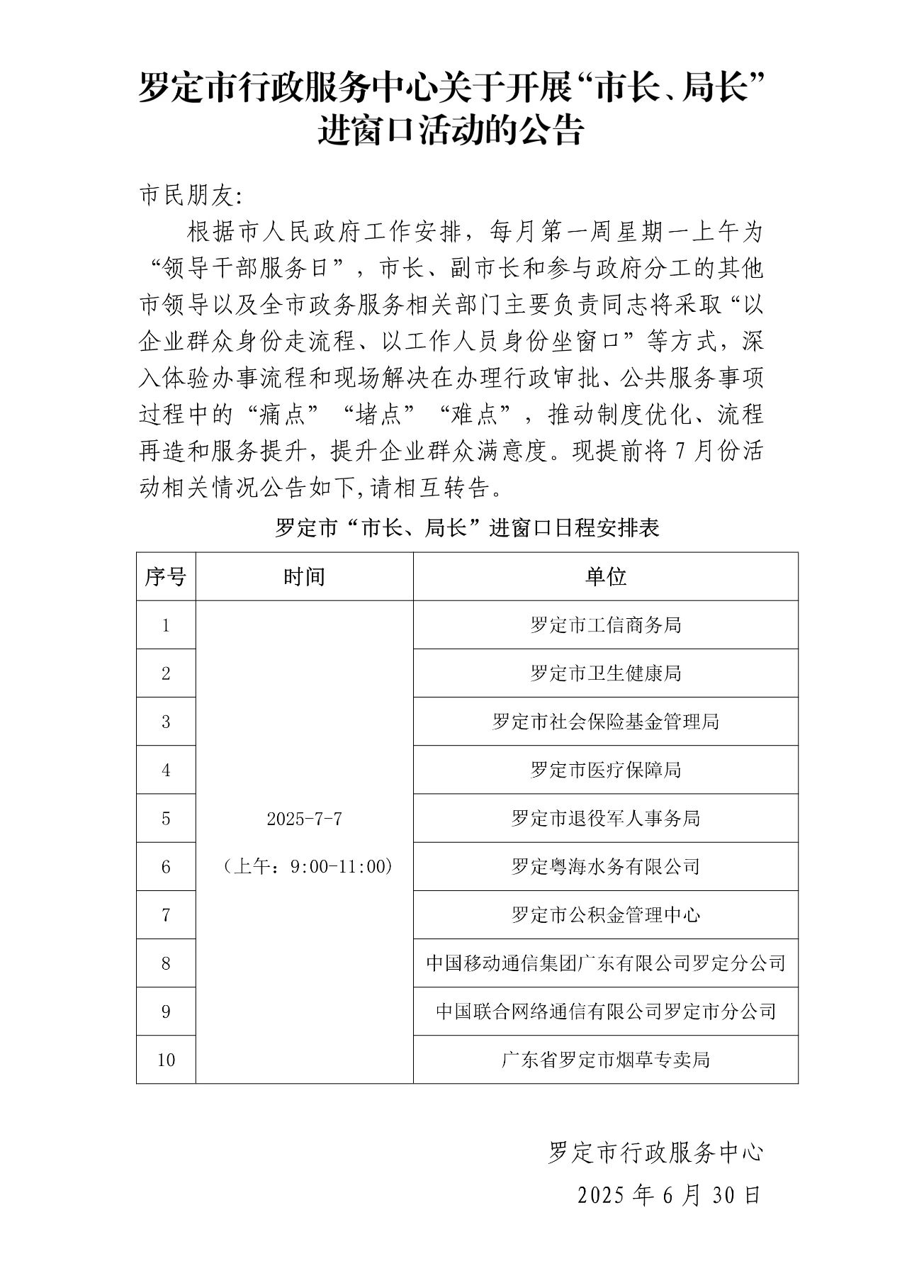 罗定市行政服务中心关于开展“市长、局长”进窗口活动的公告(7月)